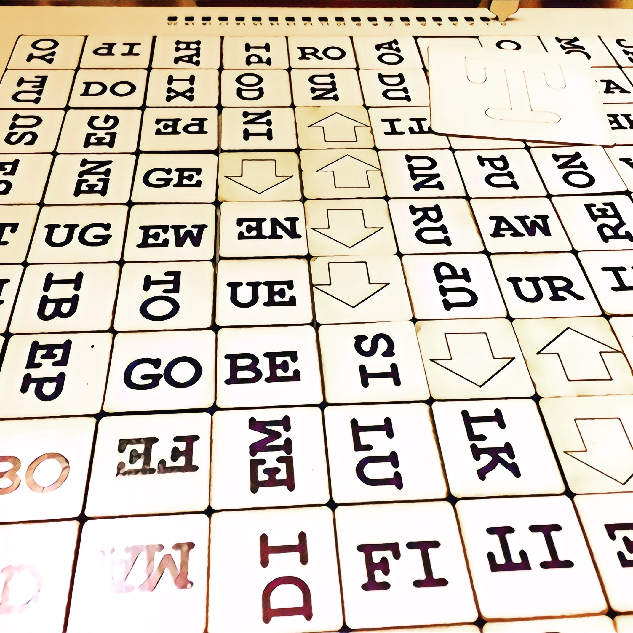 WORDSOPOLY is played on a lasercut board with room for 100 tiles. The remaining 20 tiles are replacements. Four integrated scoring tracks allow up to four players to play. Each tile has a two-letter bigram with the flip side having a single arrow. Arrows are used to indicate which of four players owns that space. (It is possible for more than four people to play by using marking tokens.) Play strategically, block others as needed.